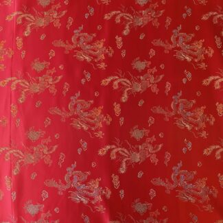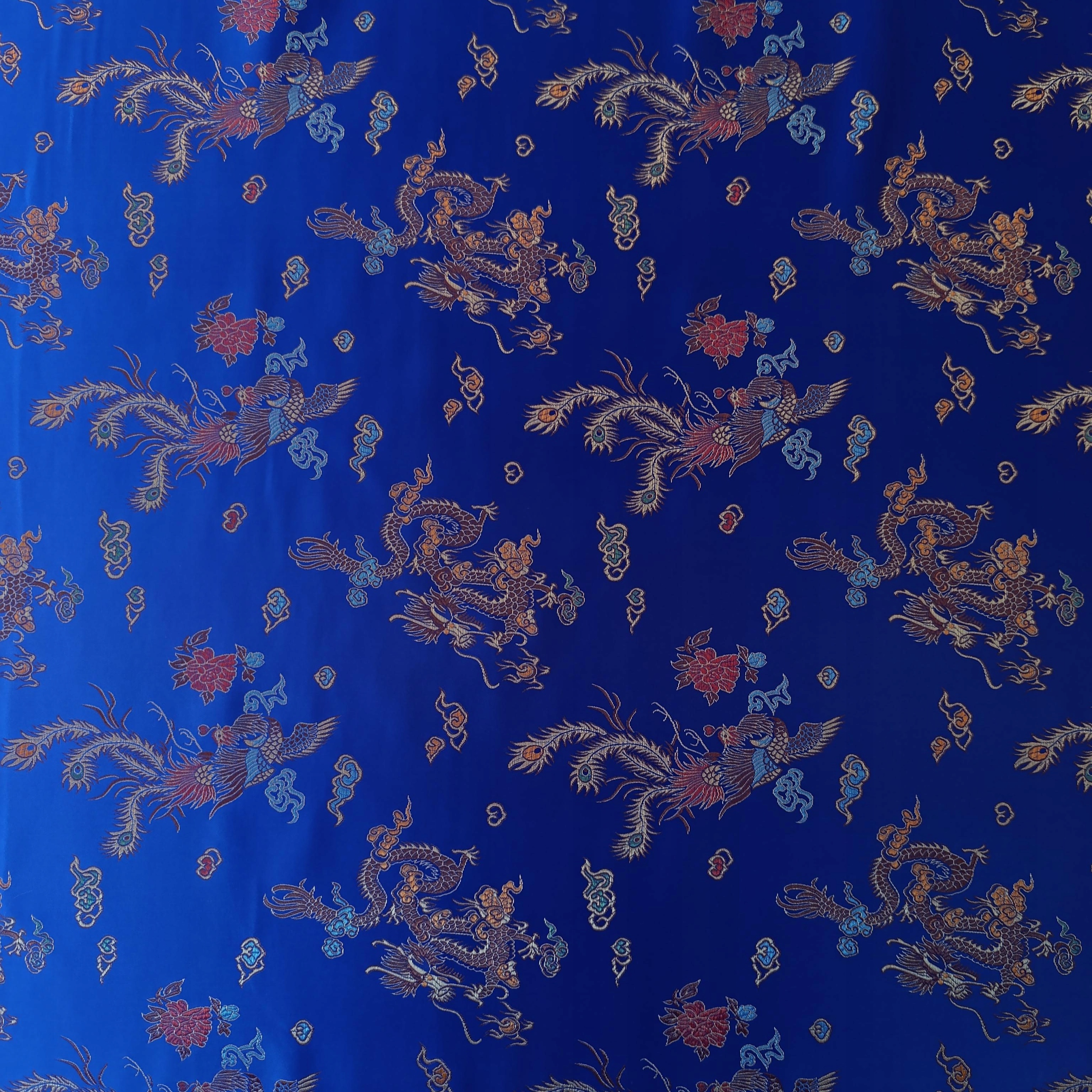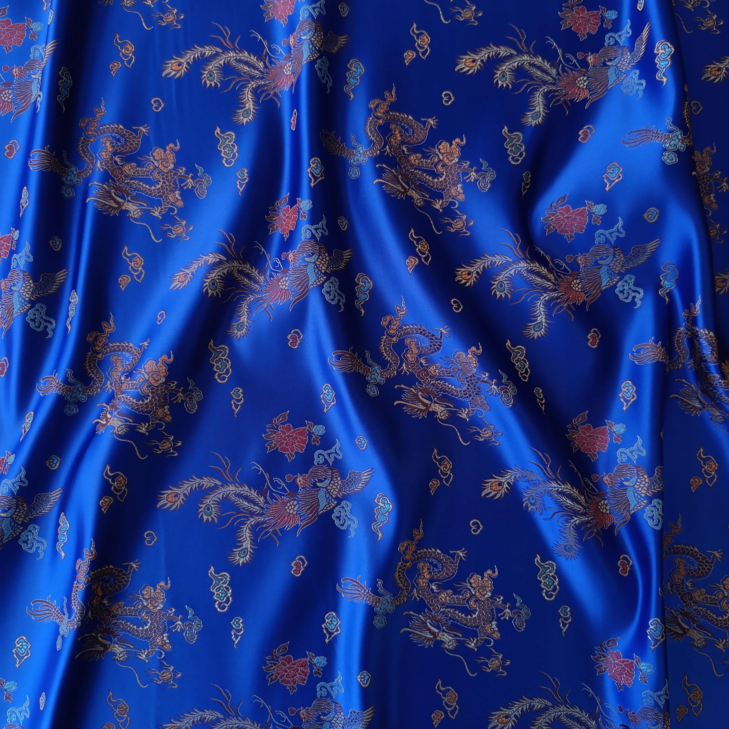 Tkanina „Smoki” to dzieło sztuki tekstylnej, łączące tradycję z wyrafinowaniem. intensywna chabrowa baza, motyw smoka, symbol siły, potęgi i fortuny w kulturze chińskiej, wyróżnia się w całej okazałości dzięki złożoności żakardowego wykonania, wykonanego z precyzją i dbałością. Połysk użytej nici nadaje tkaninie elegancki i wyrafinowany wygląd, dzięki czemu idealnie nadaje się do różnorodnych zastosowań karnawałowych.