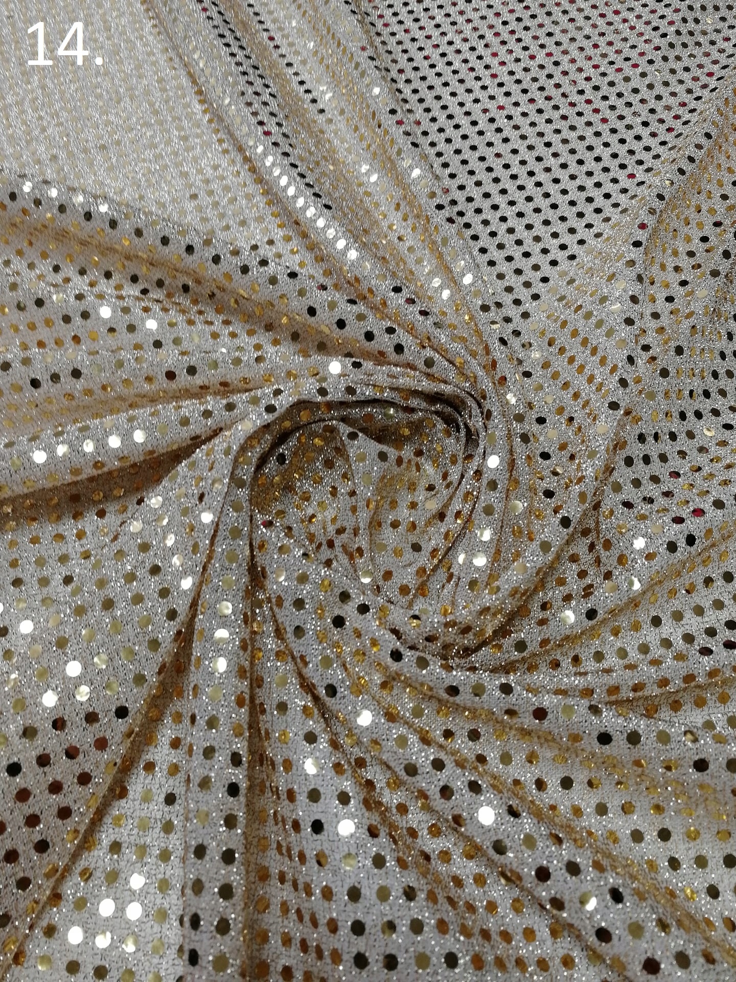 Dzianina z naklejanymi cekinami „Cekiny Lilu” nr.14 Złoto na Beżu -1/2mb