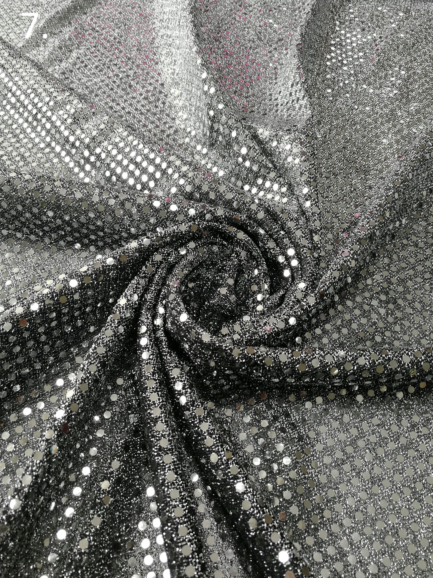 Dzianina z naklejanymi cekinami „Cekiny Lilu” nr.7 Srebrny na Czarnym